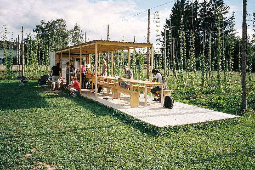 skica možných úprav veřejného prostranství u sklení uličky - altán, parkování, strom